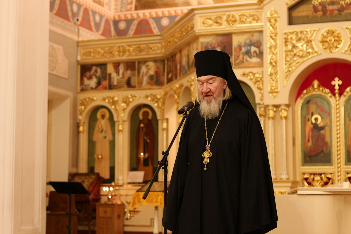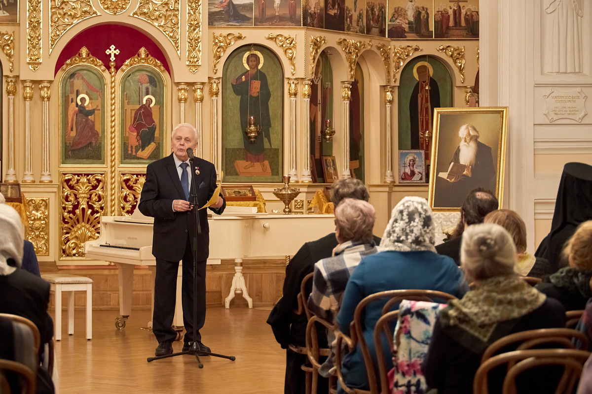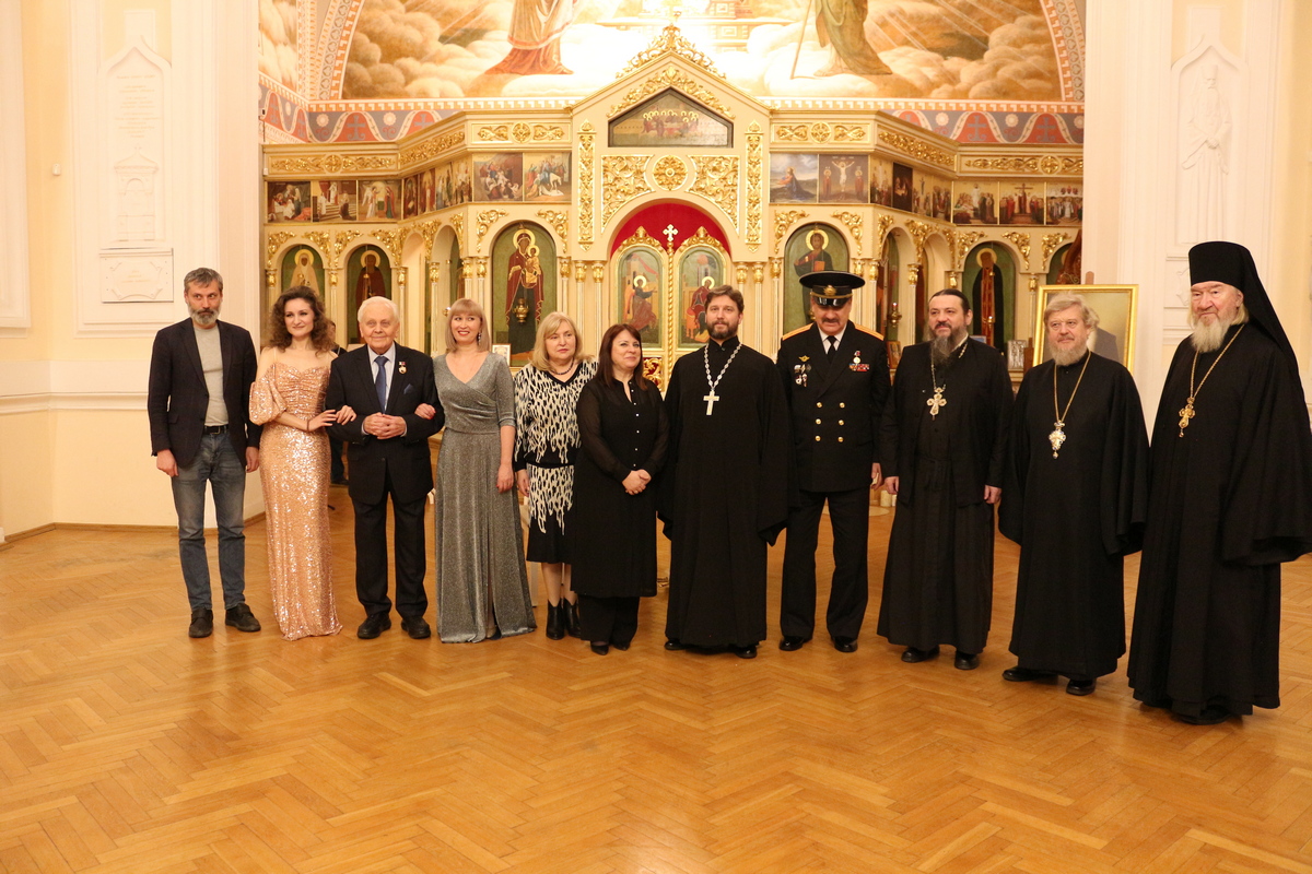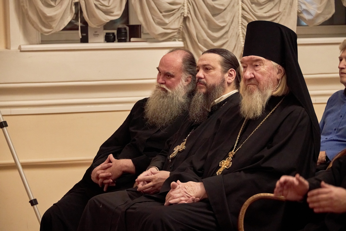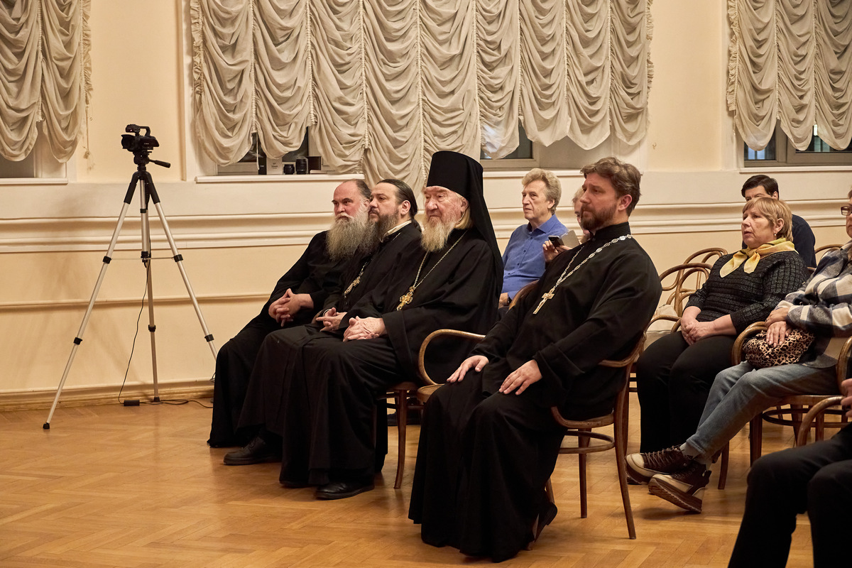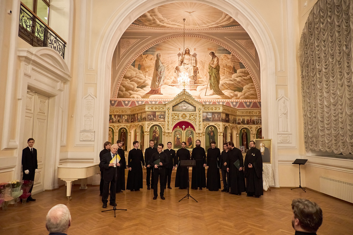 Торжественный вечер начался служением заупокойной литии, которую совершили архимандрит Сергий, архимандрит Пафнутий, протоиерей Сергий Киселев, настоятель храма Святителя Николая Мирликийского Патриаршего подворья в Здехово, и священник Кирилл Киселев, руководитель центра «Кафедра теологии».