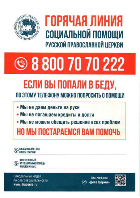 Если вы или ваши близкие оказались в трудной жизненной ситуации, можно обратиться на горячую линию социальной помощи Русской Православной Церкви. По телефону 8 800 70 70 222 принимаются обращения со всей России.